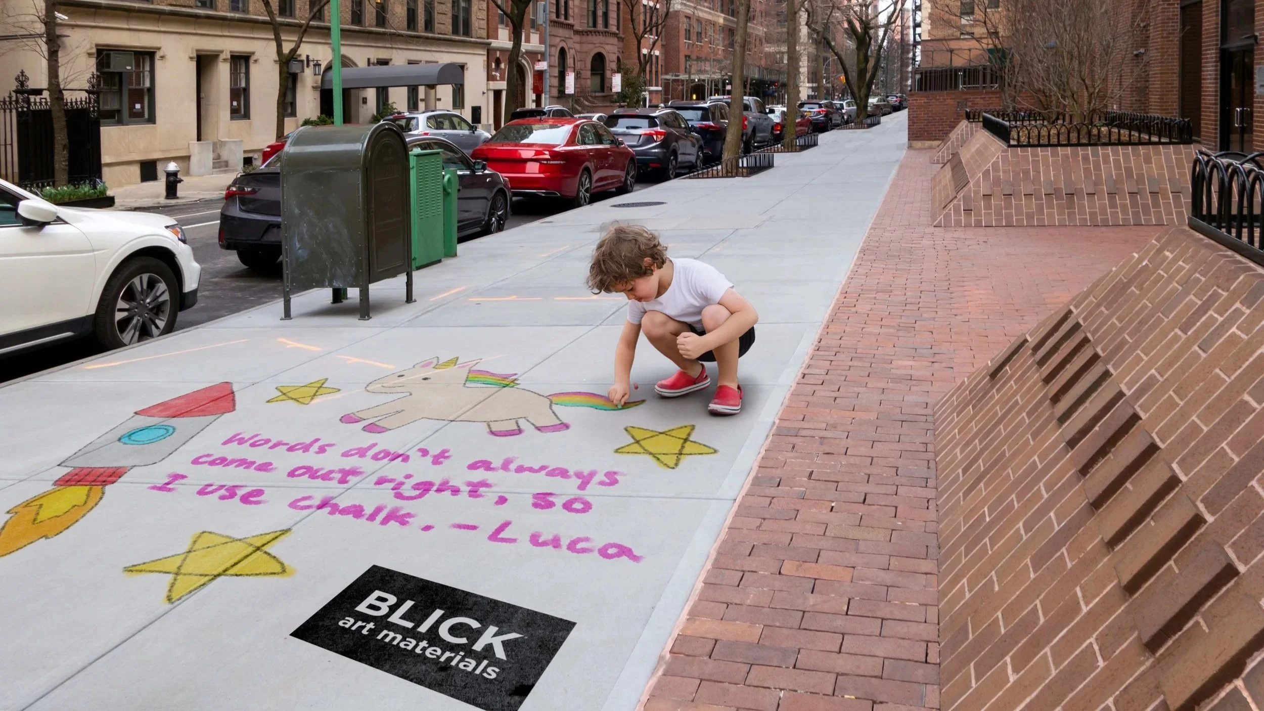 A blank sidewalk and a few chalks become a way to communicate for kids like Luca.
